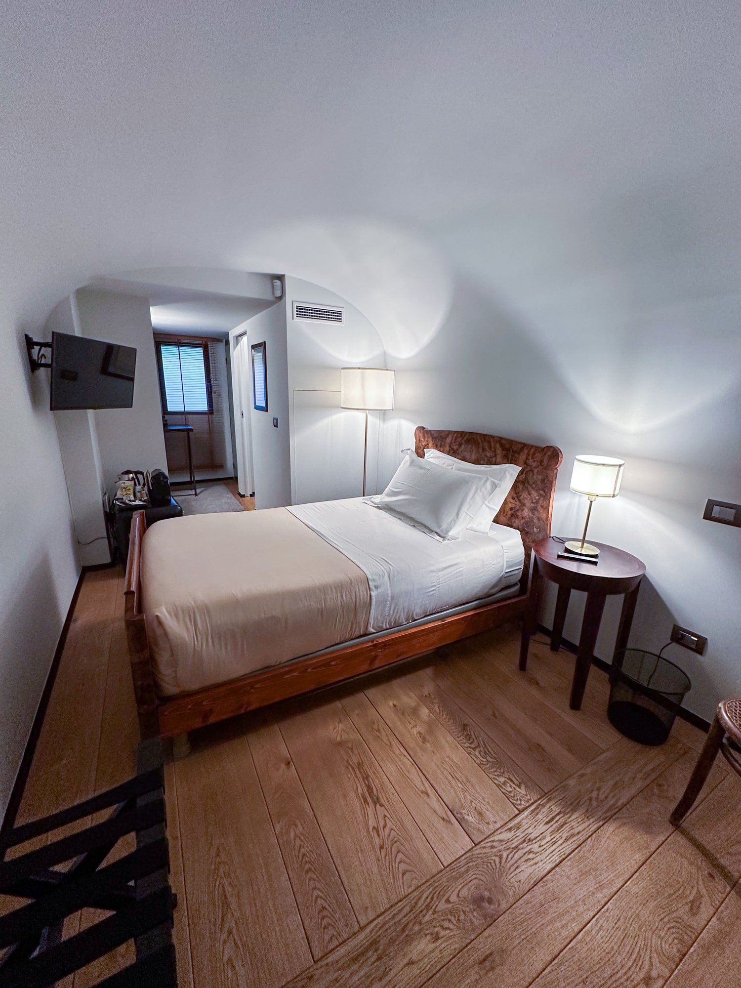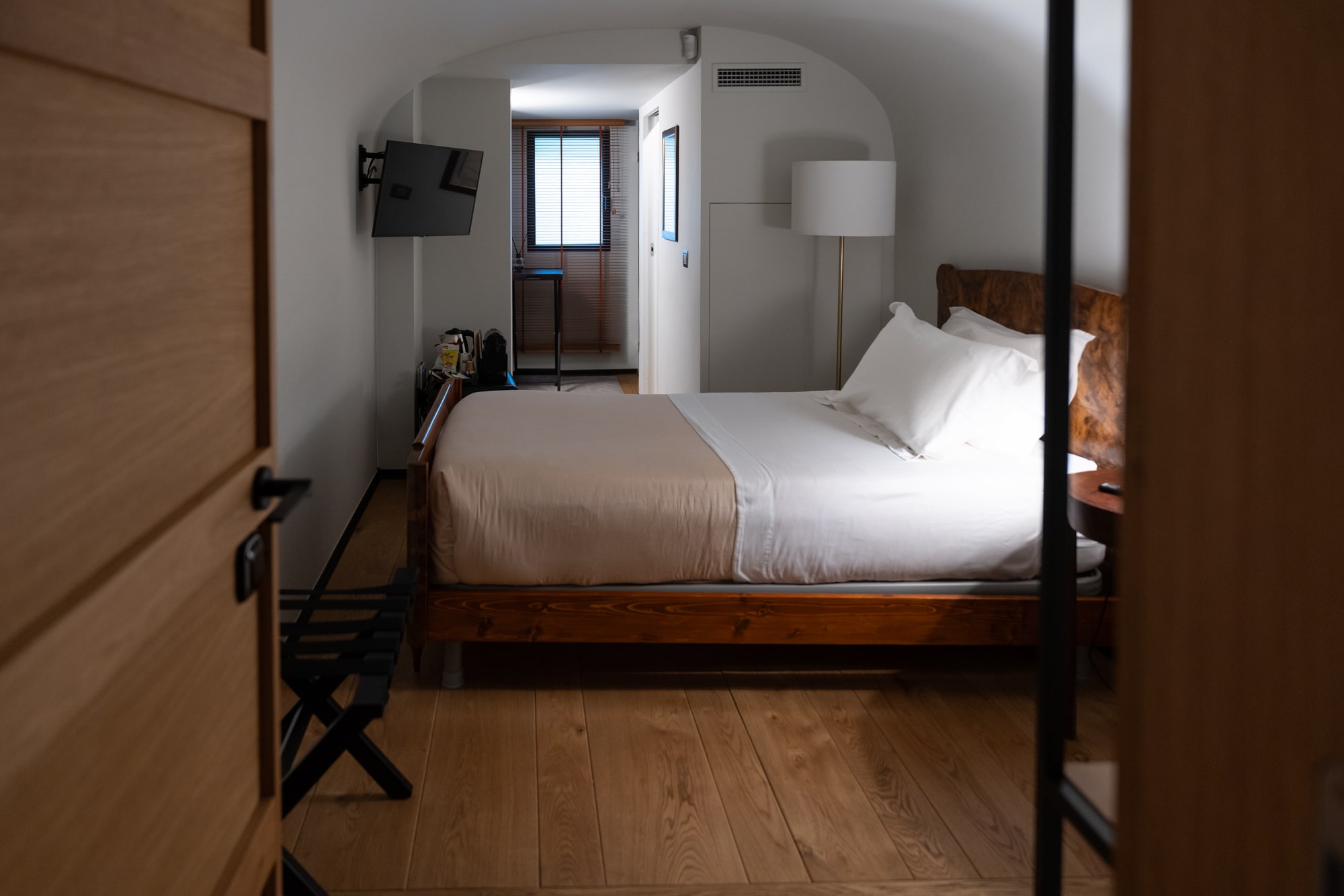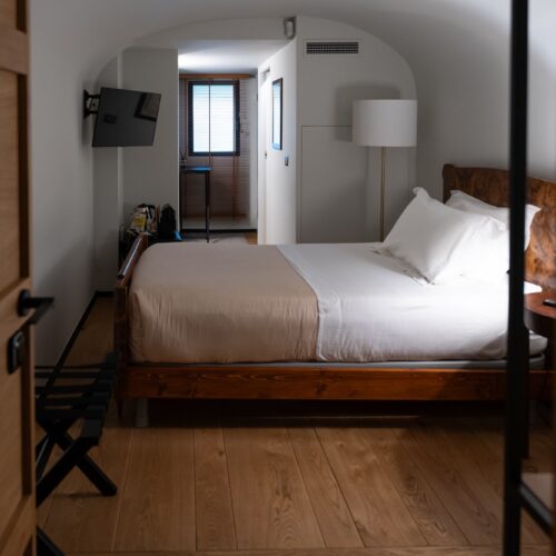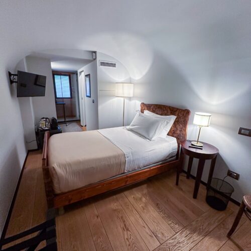 Camera singola con letto matrimoniale alla francese, raggiungibile in ascensore al primo piano. Bagno privato con doccia, biancheria, set cortesia e asciugacapelli. La camera, climatizzata e insonorizzata è dotata di connessione WiFi, TV 32”, bollitore, macchina da caffè Nespresso, mini bar.